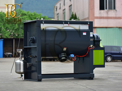 博昌答:首先我們需要在粉體臥式攪拌機設備上面裝置噴霧系統,規定多少容量,使液體變成霧化形狀噴下去,這樣就解決了問題,效果更好。
