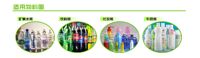 廣泛適用于廢舊的飲料瓶、礦泉水瓶、可樂瓶、紅茶瓶、綠茶瓶、娃哈哈瓶、化妝品瓶、牛奶瓶、食用油壺等各類彈性較強的PET原料的塑料瓶。