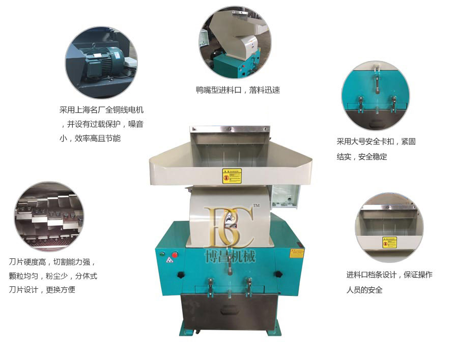 可用于箱類、薄管件、吹塑件、瓶、殼、板、罐、生活塑料用品等所有廢舊塑料的再次粉碎回收或作為注塑機的輔助機器對注塑機水口料或次品件進行重新粉碎利用。